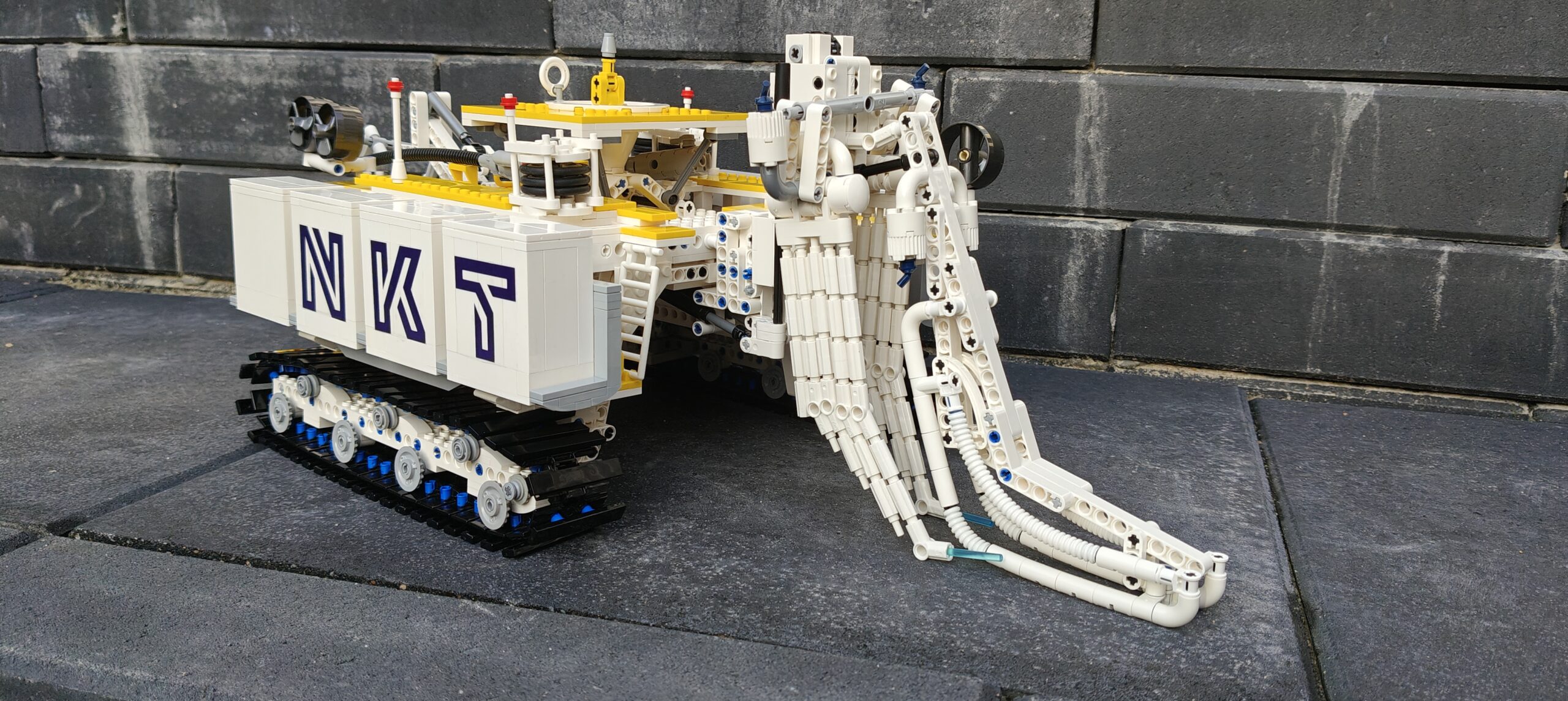 In opdracht voor Osbit offshore energy engineering hebben wij een diorama gemaakt dat hun kantoor, werkplaats, een offshore windturbine en een van hun machines laat zien. De machine op de voorgrond is de Swordfish, een machine die kabels op de zeebodem begraaft. De windturbine is gemotoriseerd en de Swordfish heeft werkende lichten. Het bouwwerk is bijna 1 x 1 x 1m, en bevat meer dan 5000 blokjes.